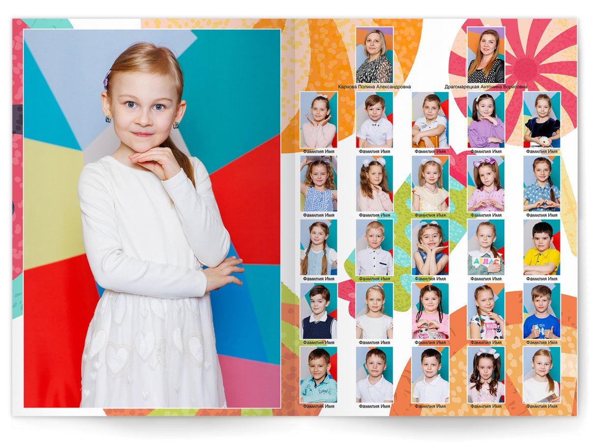 • Портреты всех детей и воспитателей на развороте
